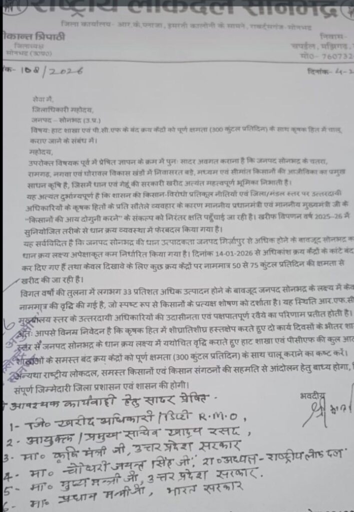श्रीकांत त्रिपाठी ने कहा कि प्रधानमंत्री एवं मुख्यमंत्री द्वारा किसानों की आय दोगुनी करने के संकल्प को मौजूदा क्रय व्यवस्था से गंभीर क्षति पहुंच रही है। खरीफ विपणन वर्ष 2025-26 में सुनियोजित तरीके से धान क्रय व्यवस्था में बदलाव कर किसानों को नुकसान पहुंचाया गया है। उन्होंने बताया कि जनपद सोनभद्र की धान उत्पादकता मिर्जापुर से अधिक होने के बावजूद यहां का क्रय लक्ष्य कम निर्धारित किया गया है। 14 जनवरी 2026 से अधिकांश क्रय केंद्रों के कांटे बंद कर दिए गए हैं, जबकि कुछ केंद्रों पर मात्र 50 से 75 कुंतल प्रतिदिन की नाममात्र खरीद की जा रही है। विगत वर्षों की तुलना में लगभग 33 प्रतिशत अधिक उत्पादन के बावजूद लक्ष्य में मामूली वृद्धि किसानों के शोषण को दर्शाती है।
