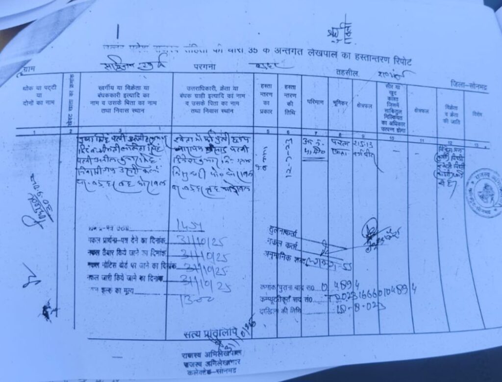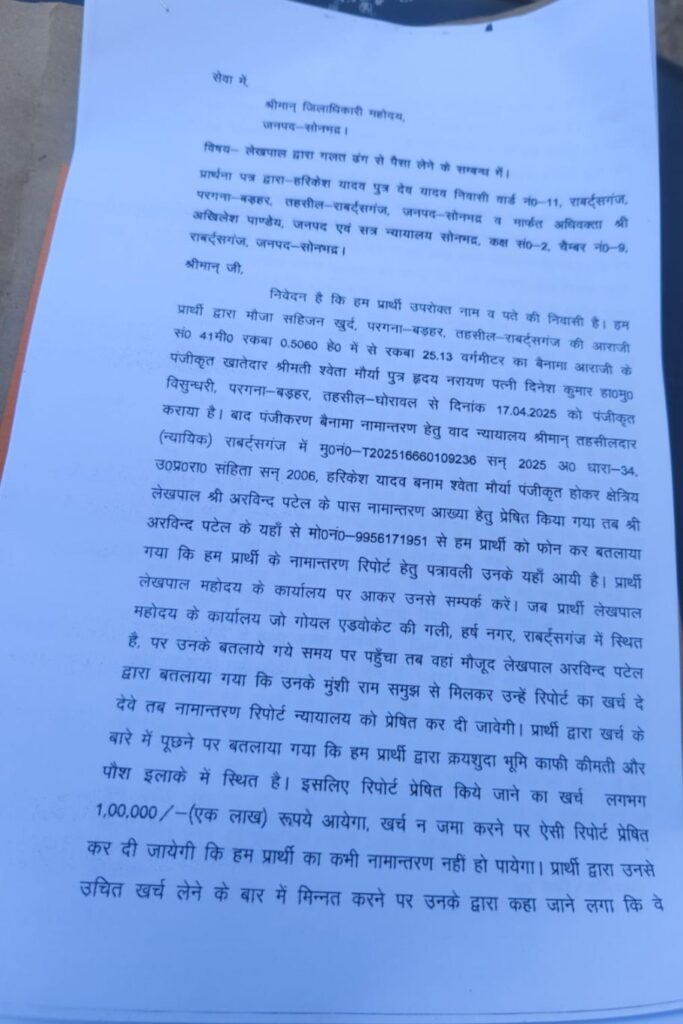 रॉबर्ट्सगंज, 10 फरवरी 2026: सोनभद्र जिले के रॉबर्ट्सगंज तहसील अंतर्गत राजस्व ग्राम सहिजन में तैनात एक लेखपाल पर भ्रष्टाचार, अवैध धन उगाही और गलत रिपोर्टिंग के गंभीर आरोप लगे हैं। स्थानीय किसानों और ग्रामीणों ने उप जिलाधिकारी को एक शिकायती पत्र सौंपकर मामले की निष्पक्ष जांच और लेखपाल के खिलाफ तत्काल कार्रवाई की मांग की है। शिकायतकर्ताओं का कहना है कि लेखपाल की मनमानी से क्षेत्र के लोग परेशान हैं और शासन की जीरो टॉलरेंस नीति का मजाक उड़ाया जा रहा है।