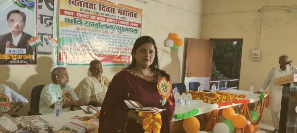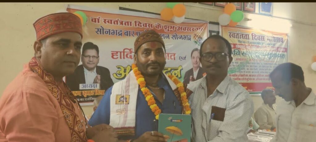 सोनभद्र। स्वतंत्रता दिवस के अवसर पर आयोजित अखिल भारतीय कवि सम्मेलन शुक्रवार को सोनभद्र बार एसोसिएशन सभागार में सकुशल संपन्न हो गया। इस मौके पर वरिष्ठ पत्रकार राजेश कुमार पाठक एडवोकेट समेत कई लोगों को अंगवस्त्र देकर सम्मानित किया गया।
