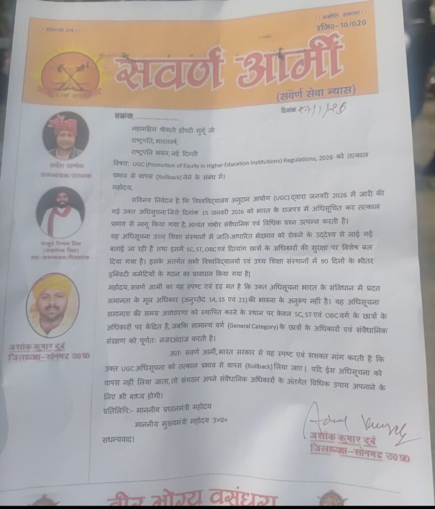 सवर्ण समाज के प्रतिनिधियों ने आरोप लगाया कि संशोधित नियम संविधान में निहित समानता के अधिकार का भी उल्लंघन करते हैं। उनका कहना था कि नियमों का मौजूदा स्वरूप संतुलनहीन है और इससे सामान्य वर्ग के छात्रों में असुरक्षा की भावना पैदा हो रही है। प्रदर्शन के दौरान वक्ताओं ने चेतावनी दी कि यदि सरकार ने इन नियमों को वापस नहीं लिया तो आंदोलन को और व्यापक किया जाएगा तथा सड़क से संसद तक संघर्ष किया जाएगा।