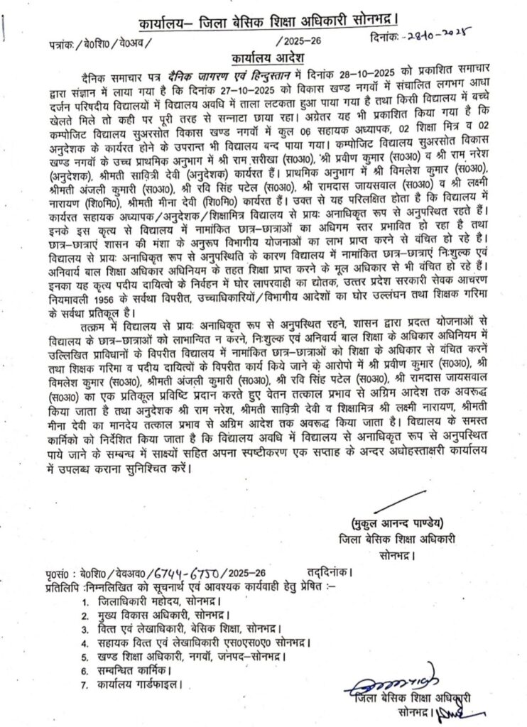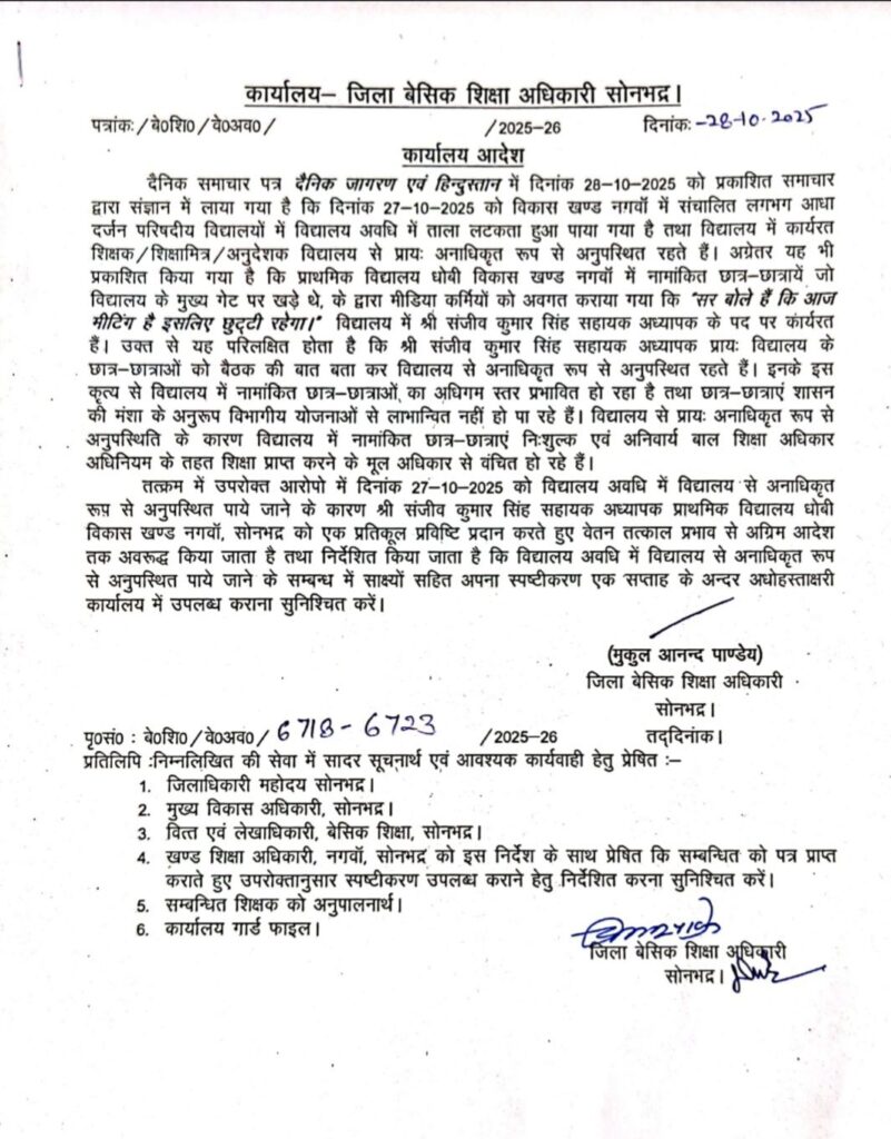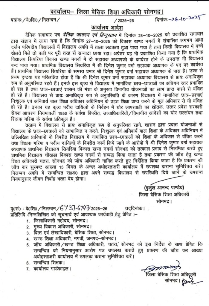 प्राप्त जानकारी के अनुसार नगवा ब्लॉक के प्राथमिक विद्यालय सूअरसोत में कार्यरत सहायक अध्यापक विमलेश कुमार और रवि सिंह पटेल को 27 अक्टूबर को विद्यालय में अनुपस्थित रहने के आधार पर निलंबित कर दिया गया। जबकि दोनों शिक्षकों का उक्त तिथि का अवकाश पूर्व में स्वीकृत था।