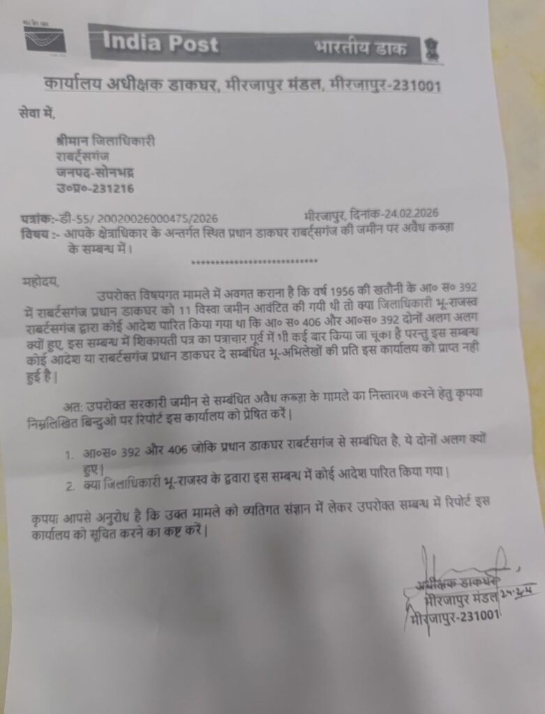 पत्र में बताया गया है कि वर्ष 1956 की खतौनी के अनुसार खाता संख्या 392 में रावर्ट्सगंज प्रधान डाकघर को 11 विश्वा जमीन आवंटित की गई थी। इसके बावजूद खाता संख्या 405, 406 जिसका नया नंबर 392 है को अलग-अलग दिखाया जा रहा है।पत्र में कहा गया है कि डाक विभाग ने कई बार शिकायत की, लेकिन जिला अधिकारी (भू-राजस्व) की ओर से अभी तक कोई स्पष्ट आदेश या कार्रवाई नहीं हुई है।