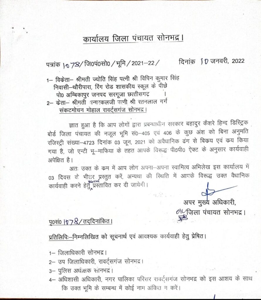 गिरीश पाण्डेय ने बताया कि अपर मुख्य अधिकारी, जिला पंचायत सोनभद्र ने 10 जनवरी 2022 को पत्रांक संख्या 1078/जिपंसो/2021-22 के माध्यम से विक्रेता और क्रेता को नोटिस जारी किया था। नोटिस में निर्माण कार्य तुरंत रोकने और न रोके जाने पर पीपी एक्ट (एंटी भू-माफिया एक्ट) के तहत मुकदमा दर्ज कराने की चेतावनी दी गई थी।